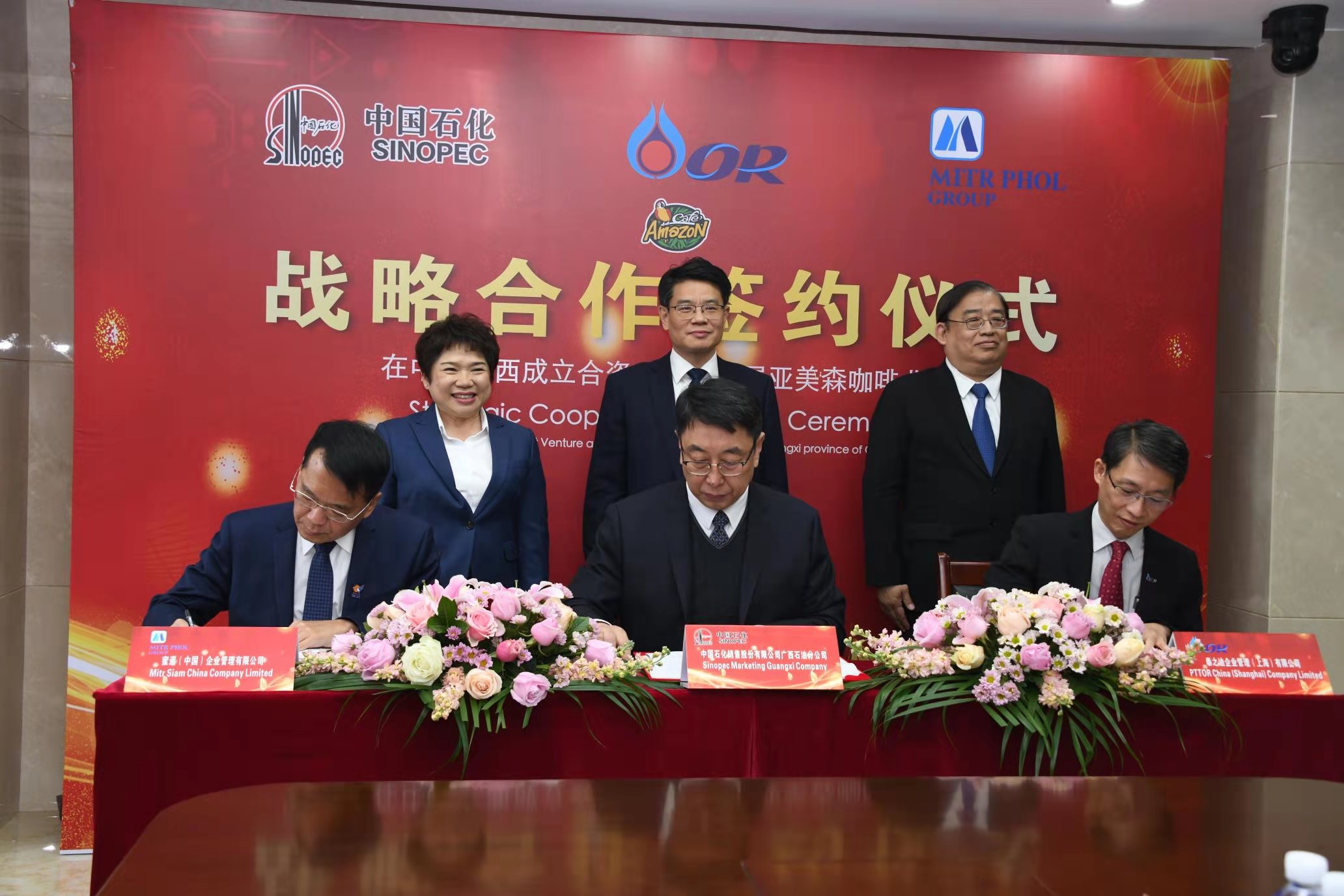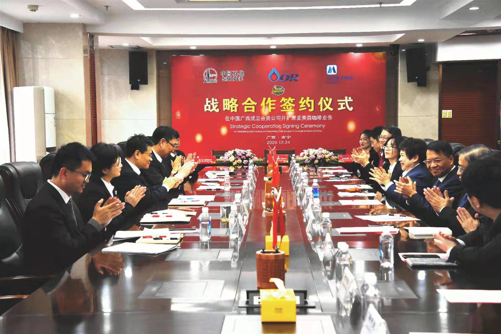 2020年12月24日(星期四)下午,中石化广西分公司、蜜暹(中国)企业管理有限公司及泰之油(上海)企业管理有限公司三方举行“战略合作框架协议签约仪式”,就今后在广西成立合资公司并扩展亚美森咖啡业务达成合作共识。中石化广西分公司总经理苏云河、广西南宁东亚糖业集团首席运营官兼总裁林家乐、泰之油(上海)公司总经理马学高作为三方签约人在战略合作框架协议上签字,中石化广西分公司代表、党委书记李玉杏、泰王国驻南宁总领事馆彬嘉玛总领事及符万信副总领事出席签约活动并见证签约。