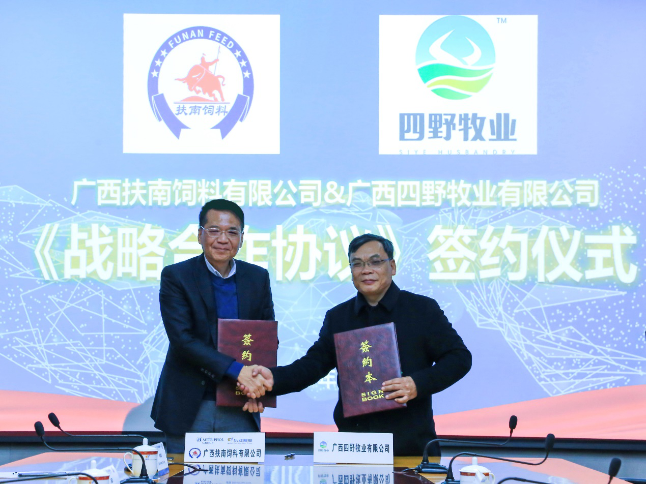 2021年1月7日下午3时,广西扶南饲料有限公司与广西四野牧业有限公司举行“战略合作协议签约仪式”。双方就今后在饲料养殖业务达成共识,东亚糖业集团林家乐COO&总裁及广西四野牧业有限公司伍关宗董事长作为双方签约代表在战略合作协议上签字。集团莫晓冰总经理、雷健总经理、马军总经理参加签字仪式。