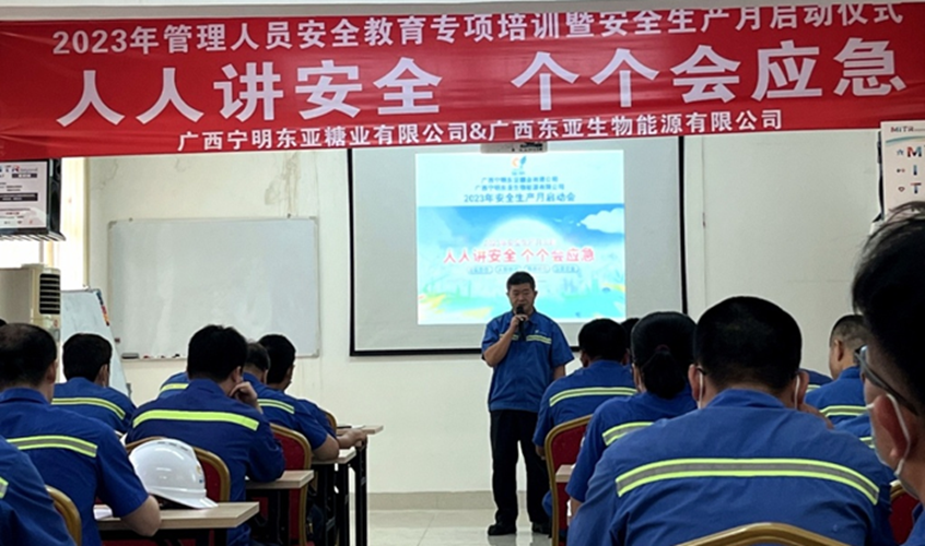 图为:广西宁明东亚糖业有限公司组织开展安全教育专项培训暨2023年安全生产月启动仪式