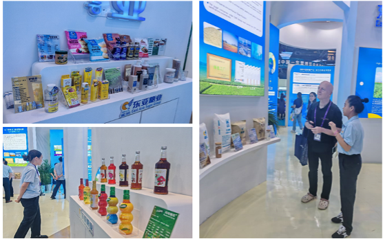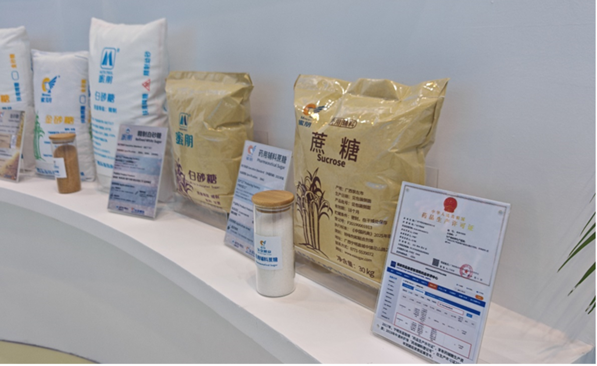 东亚糖业位于人工智能展区内117平方米的展位独具特色,展台设计的诸多元素寓意深远,亮点纷呈。展位整体呈“8”字形,寓意东亚糖业以高端化、智能化、绿色化引领企业高质量发展,形成糖业循环经济综合利用的产业链闭环;展位的亮点之一是中心位置的“智慧农业”+“智能工厂”沙盘,其中“智慧农业”部分以公司现代农场示范项目为蓝本,从耕、种、管、收等环节形象体现“智慧农业”数字化落地场景;“智能工厂”部份则以广西崇左东亚糖业有限公司的厂景浓缩打造,充分展现了广西制糖行业首家“智能制造标杆企业”的风采。东亚糖业展示柜台上,母公司两仪集团生产的瓶装风味液体糖浆、以蔗糖副产物为原料的化妆品、沐浴露、防晒霜等系列生物基新产品,东亚糖业生产的高品质药用辅助蔗糖、“蜜朋牌”精制白砂糖、黄冰糖、单晶冰糖、红糖、利用蔗叶蔗渣等生产的反刍生物蛋白饲料、高效安全的“素旺牌”掺混肥料.....各种糖业产业链条上富有科技含量的产品琳琅满目,令人目不暇接。