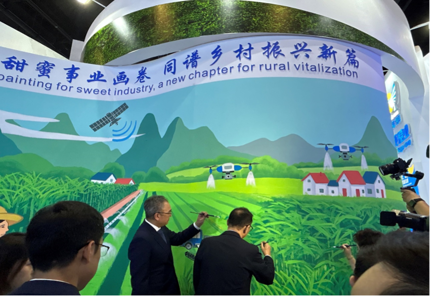 展位引人注目的又一亮点是一幅面积18平方米的写生彩绘。该彩绘以东亚糖业蔗区典型的“现代农场”为切面场景,事先请专业画师现场绘制了大部份画作的轮廓。在展览期间则请参观展位的嘉宾领导和观众,在浅淡底色的甘蔗茎叶上再用画笔施以浓墨重彩,起到茂林以修蔗、画龙而点睛的作用,寓意:共绘甜蜜事业画卷,同谱乡村振兴新篇。